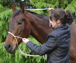 Guide the nose piece of the halter onto the nose of the horse with your left hand, whilst still holding the length of the halter with your right