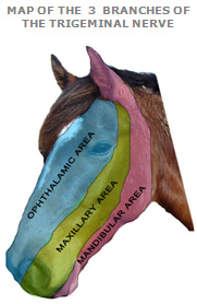 Trigeminal pain can target areas of the face that may have no contact with the bit. The many branches of the trigeminal nerve form a very complex network. Pain is transferred along nerve pathways to seemingly unrelated locations very quickly hence a horse who experiences bit trauma could feel pain around their ears and exhibit irritated behaviour in avoiding them being touched if the nerves of the mandibular area were inflamed. Some common symptoms are :