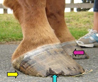 The tendency for forward (rather than upward) hoof growth, along with incorrect or infrequent trimming has resulted in heels that have migrated too far forward, with downward force being concentrated in an area which has no support. (yellow arrow)