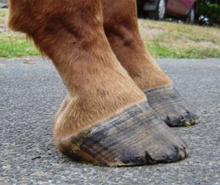 The toes are too long from either incorrect or infrequent trimming. Break over becomes difficult and excess force is placed on the toe area of the hoof resulting in compromised wall/laminar connection