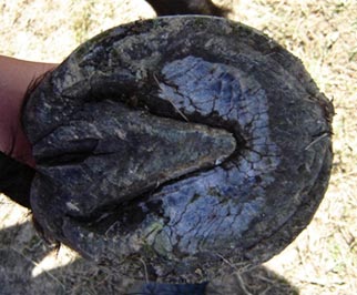 The tendency for flared (rather than upward) hoof growth in conjunction with stress from infrequent or incorrect trimming has resulted with probable stretching of the laminar/wall connection.