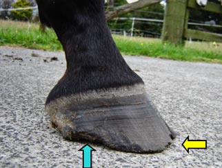 The toes are too long from either incorrect or infrequent trimming. Break over becomes difficult and excess force is placed on the toe area of the hoof resulting in compromised wall/laminar connection. (yellow arrow)