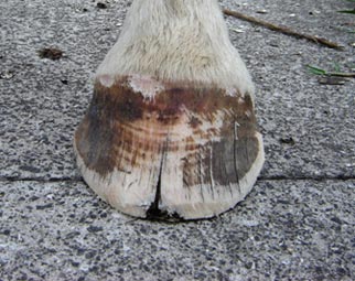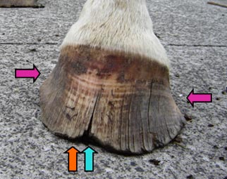 The tendency for flared (rather than upward) hoof growth in conjunction with stress from infrequent or incorrect trimming has resulted with probable stretching of the laminar/wall connection. (pink arrows)