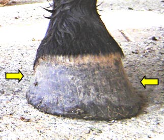 The tendency for flared (rather than upward) hoof growth in conjunction with stress from infrequent or incorrect trimming has resulted with probable stretching of the laminar/wall connection. (yellow arrows)