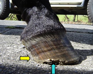 The splits, chips, cracks and breakages have occurred due to a combination of factors - usually poor hoof horn along with either infrequent or incorrect trimming. (turquoise arrows)