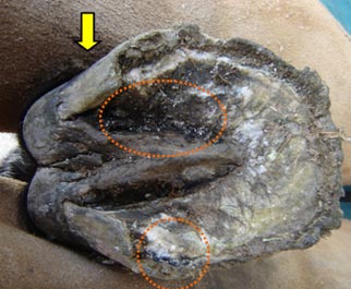 Little or no contact of the sole with the ground has prevented it from exfoliating naturally. This has caused a build up of dead tissue which has been invaded by bacteria/fungi, giving the affected area a blackish appearance on the surface. When partially removed, a crumbly white interior is revealed. (orange dotted circles)