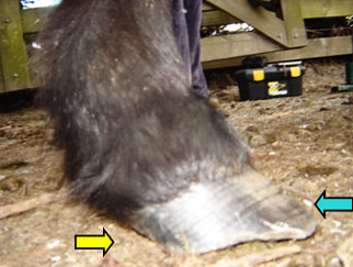 The tendency for forward (rather than upward) hoof growth, along with incorrect or infrequent trimming has resulted in heels that have migrated too far forward, with downward force being concentrated in an area which has no support. (yellow arrow)