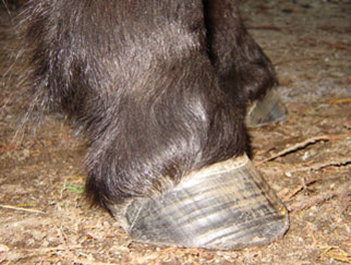 The tendency for flared (rather than upward) hoof growth in conjunction with stress from infrequent or incorrect trimming has resulted with probable stretching of the laminar/wall connection.