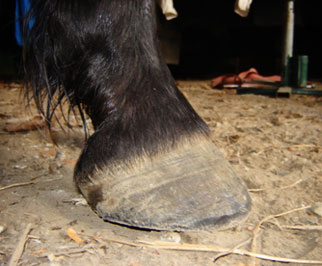 The toes are too long from either incorrect or infrequent trimming. Break over becomes difficult and excess force is placed on the toe area of the hoof resulting in compromised wall/laminar connection.