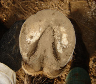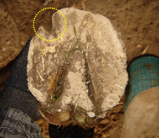 The splits, chips, cracks and breakages have occurred due to a combination of factors - usually poor hoof horn along with either infrequent or incorrect trimming. (yellow dotted circle)
