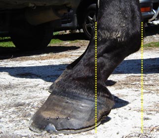The tendency for forward (rather than upward) hoof growth, along with incorrect or infrequent trimming has resulted in heels that have migrated too far forward, with downward force being concentrated in an area which has no support. (yellow dotted lines)