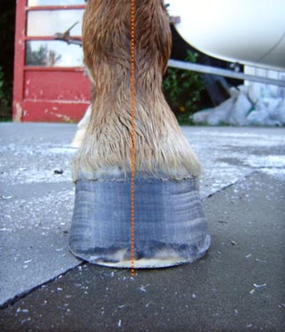 Note the angle of the coronet band - it is almost ground parallel which indicates excessive weight bearing force is centred on the toe area rather than the heel. (purple arrow)