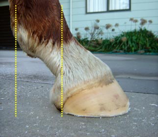 The heels are too high, which promotes a toe first landing. This inhibits extension of joints in the limb, places stress on the tendons and ligaments, and incorrectly distributes weight onto the front area of the hoof - an area not designed to incur such extreme force. (yellow dotted lines)