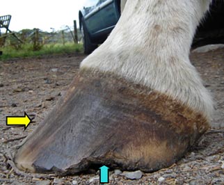 The toes are too long from either incorrect or infrequent trimming. Break over becomes difficult and excess force is placed on the toe area of the hoof resulting in compromised wall/laminar connection. (yellow arrows)