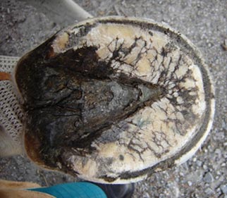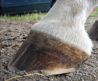 The tendency for flared (rather than upward) hoof growth in conjunction with stress from infrequent or incorrect trimming has resulted with probable stretching of the laminar/wall connection.