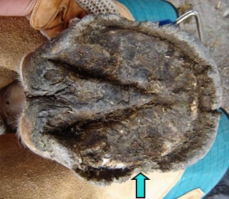 The splits, chips, cracks and breakages have occurred due to a combination of factors - usually poor hoof horn along with either infrequent or incorrect trimming. (turquoise arrows)