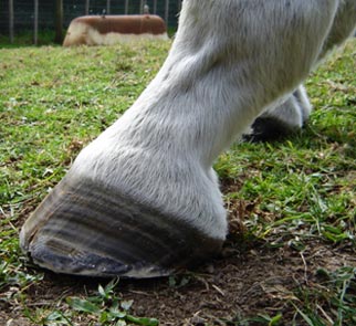 The tendency for forward (rather than upward) hoof growth, along with incorrect or infrequent trimming has resulted in heels that have migrated too far forward, with downward force being concentrated in an area which has no support.