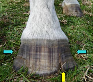 The tendency for flared (rather than upward) hoof growth in conjunction with stress from infrequent or incorrect trimming has resulted with probable stretching of the laminar/wall connection. (turquoise arrows)