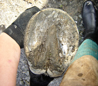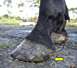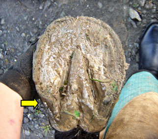 The tendency for forward (rather than upward) hoof growth, along with incorrect or infrequent trimming has resulted in heels that have migrated too far forward, with downward force being concentrated in an area which has no support. (yellow arrows)
