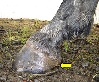 The heels are too high, which promotes a toe first landing. This inhibits extension of joints in the limb, places stress on the tendons and ligaments, and incorrectly distributes weight onto the front area of the hoof - an area not designed to incur such extreme force. (yellow arrows)