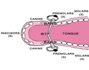 A bit is described as a piece of metal [or tough material] that is placed over the tongue in the horse's mouth and which sits across the bars in the mouth [a space of gum covered bone which lies between the two sets of front and back teeth]. The bit is held firmly in the mouth by the bridle, which forms an inescapable circle around the horse's head and nose. Reins are attached to the ends of the bit, which the handler pulls either singly or in combination, either lightly or harshly to control or direct the horse. Reins [and therefore the bit] are often used by most riders to maintain balance or to regain and recover from over balancing.