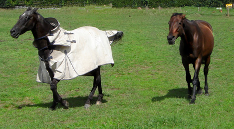 Example : the above photo shows the dominant herd leader - a bay mare moving purposefully with her ears pinned back towards the less dominant covered appaloosa. It's obvious she is showing a high intent or energy which correlates with her body movement. The less dominant horse understands this language very clearly, quickly moves away from the cause of pressure - the mare, and by so doing gains a release from the pressure or discomfort. In fact this natural cause and effect is common - as humans we also move away from pressure or discomfort emotionally or physically, although we possess verbal skills to communicate as well. As an example, if a person pricks you with a pin, one would naturally move away from the discomfort. If a person invades your personal space, again one naturally feels inclined to move away. Horses rely on this single non verbal way of communicating in every interaction they have with one another, every day of their lives, and it is never forgotten or ignored.