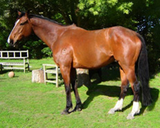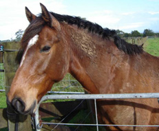 Thoroughbred mare (Misty) close up showing a healthy coat which is thin, short and shiny in the middle of summer