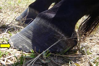 The toes are too long from either incorrect or infrequent trimming. Break over becomes difficult and excess force is placed on the toe area of the hoof resulting in compromised wall/laminar connection. (yellow arrow)