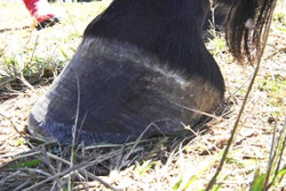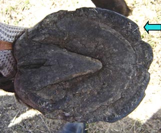 The tendency for flared (rather than upward) hoof growth in conjunction with stress from infrequent or incorrect trimming has resulted with probable stretching of the laminar/wall connection.