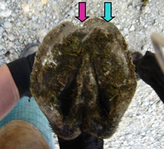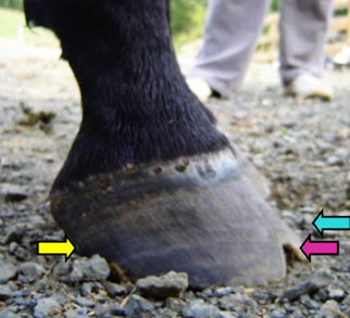 The tendency for forward (rather than upward) hoof growth, along with incorrect or infrequent trimming has resulted in heels that have migrated too far forward, with downward force being concentrated in an area which has no support. (yellow arrow)