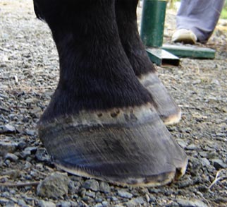 The tendency for flared (rather than upward) hoof growth in conjunction with stress from infrequent or incorrect trimming has resulted with probable stretching of the laminar/wall connection.