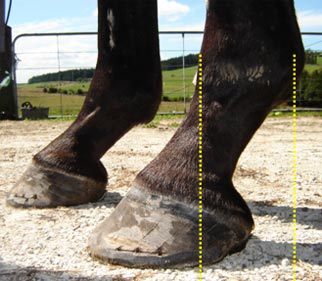 The tendency for forward (rather than upward) hoof growth, along with incorrect or infrequent trimming has resulted in heels that have migrated too far forward, with downward force being concentrated in an area which has no support. (yellow dotted lines)
