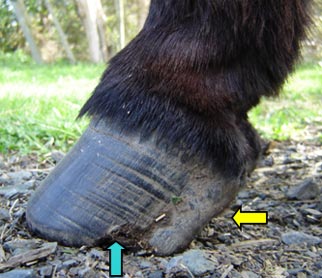 The splits, chips, cracks and breakages have occurred due to a combination of factors - usually poor hoof horn along with either infrequent or incorrect trimming. (turquoise arrow)