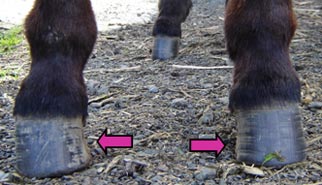 Misalignment of the skeletal structure or incorrect trimming has contributed to excessive strain on one side of the hoof. Because of this uneven weight distribution, one side has grown long and flared which indicates there is probable stretching of the laminar/wall connection. (pink arrows)