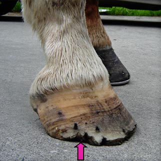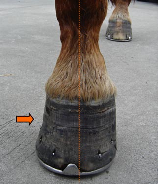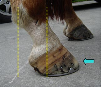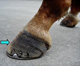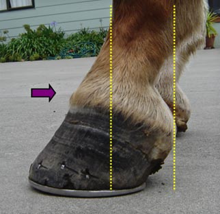 Note the angle of the coronet band - it is almost ground parallel which indicates excessive weight bearing force is centred on the toe area rather than the heel. (purple arrow)