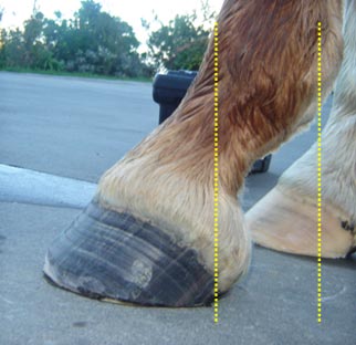 The heels are too high, which promotes a toe first landing. This inhibits extension of joints in the limb, places stress on the tendons and ligaments, and incorrectly distributes weight onto the front area of the hoof - an area not designed to incur such extreme force. (yellow dotted lines)