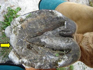 The splits, chips, cracks and breakages have occurred due to a combination of factors - usually poor hoof horn along with either infrequent or incorrect trimming. (yellow arrow)