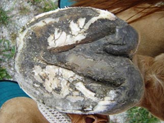 Misalignment of the skeletal structure or incorrect trimming has contributed to excessive strain on one side of the hoof. Because of this uneven weight distribution, one side has grown long and flared which indicates there is probable stretching of the laminar/wall connection.