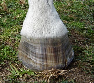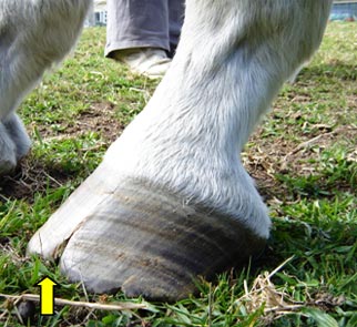 The tendency for forward (rather than upward) hoof growth, along with incorrect or infrequent trimming has resulted in heels that have migrated too far forward, with downward force being concentrated in an area which has no support.